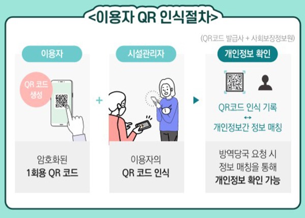 전자출입명부는 시설 이용자가 네이버(QR코드 발급회사) 등에서 앱으로 QR코드를 발급받은 후 시설관리자에게 제시하는 방식으로, 시설관리자는 이용자의 QR코드를 인식하며 해당 정보는 사회보장정보원으로 이송해 보관한다.