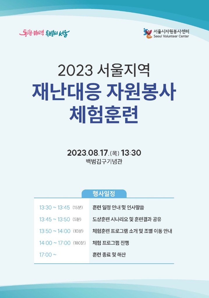 17일(목), 서울시자원봉사센터는 백범김구기념관에서 바로봉사단원, 재난대응 협력기관(단체), 자원봉사센터 등 서울시민 300여 명이 함께 서울지역 ‘재난대응 자원봉사 체험훈련’을 실시한다.