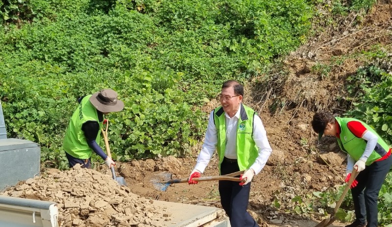 김 의장은 이날 오전 가포동 드림베이대로 아래 가포해안길 굴다리 앞을 가로막은 토사를 치웠다. 가포동 자율방재단을 비롯한 통장단, 새마을부녀회, 푸르미클린팀 등과 함께 환경 정비 작업을 했다.