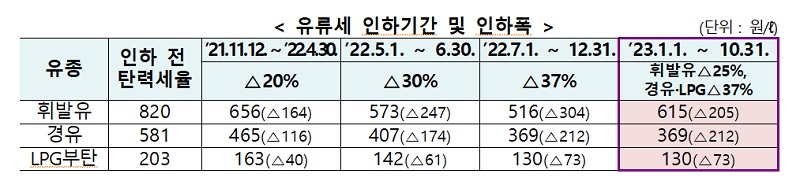 이번 조치로 유류세 인하 전 세율 대비 휘발유는 리터(ℓ)당 205원, 경유는 212원, LPG부탄은 73원 각각 가격 인하 효과가 2개월간 유지된다.