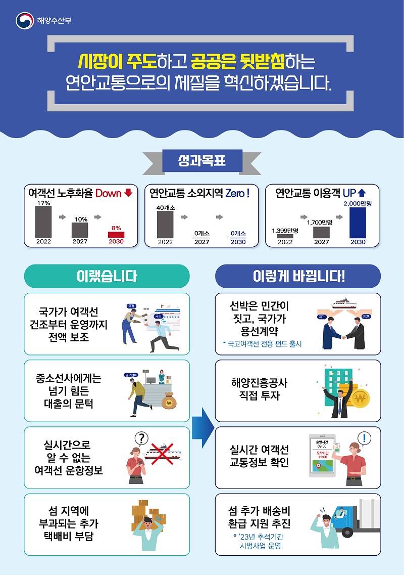 또 여객선 터미널·선착장 등 안전시설 보강, 안전정보 투명 공개 등을 통해 여객선 이용 안전에 대한 국민 우려를 불식시키는 한편, 연안교통수단으로부터 소외된 섬 제로화 등 대중교통으로서의 역할도 강화한다.