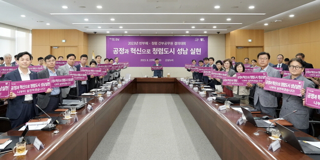 성남시는 17 일 신상진 시장을 비롯해 간부 공무원과 산하기관 대표들이 참가한 가운데 반부패 ‧ 청렴 내용을 점검하고 , 청렴 문화 구축과 청렴 조직문화를 대내외에 천명 및 확산하기 위해 ‘2023 년 반부패 ‧ 청렴 결의대회 ’ 를 열었다 .