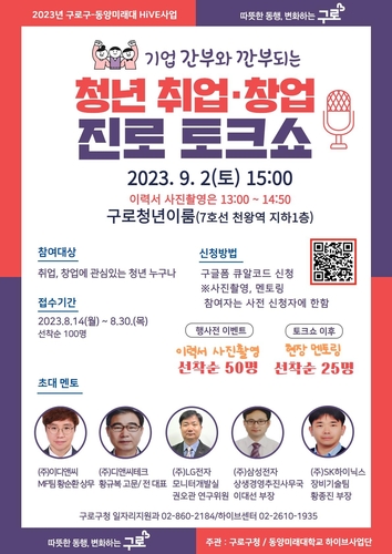 구로구가 동양미래대와 공동으로 추진하는 하이브 사업의 일환으로 '2023년 청년 취업·창업 진로 토크쇼'를 개최한다.