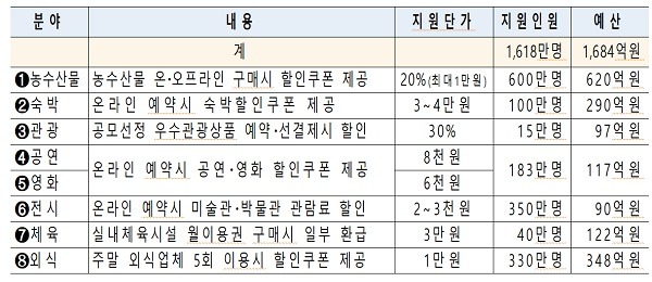내수와 수출, 지역경제 활성화를 위해서도 3조7000억원을 집중 투자한다. 소비 활력 제고를 위해 숙박, 공연 등 8대 분야에 할인소비쿠폰 1684억원어치를 지급한다. 온누리상품권과 지역사랑상품권은 5조원 추가 발행하고, 고효율가전제품에 대한 구입 지원을 1500억원에서 4500억원으로 3배 늘린다.