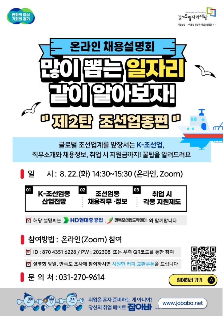 경기도일자리재단(이하 재단)이 ‘많이 뽑는 일자리, 같이 알아보자!’ 프로젝트 2탄으로 조선업종 부문 온라인 채용설명회를 연다.