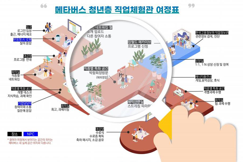 한국고용정보원은 메타버스 상에서 AI 기반의 잡케어 서비스, 워크넷 취업 정보, 직업심리검사, 직업훈련 정보, 온라인 청년센터 등과 연계해 청년 개인별 직무능력과 관심 직종을 탐색하고 미래 진로 설계를 지원하는 기능도 제공할 계획이다.
