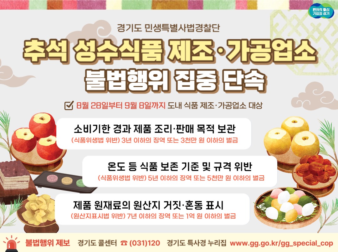 경기도 특별사법경찰단이 8월 28일부터 9월 8일까지 추석 명절 선물‧제수용 식품의 안전을 선제적으로 강화하기 위해 제조·가공업소 360개소를 집중 단속한다.