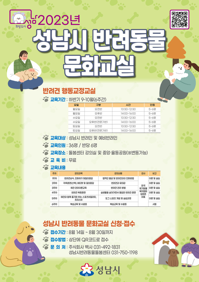성남시는 성숙한 반려동물 문화 조성을 위하여 반려동물 문화교실을 상반기와 하반기로 나누어 운영 중이다. 하반기 문화교실은 9월 2일 개강 예정이며 6주동안 진행된다.