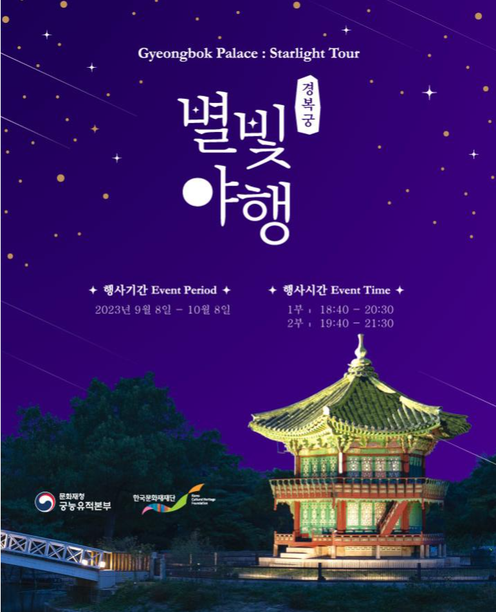 문화재청 궁능유적본부는 한국문화재재단과 함께「2023년 경복궁 별빛야행」하반기 행사를 오는 9월 8일부터 10월 8일까지 1일 2회씩 개최하며, 오는 23일(수) 오후 2시부터 예매권 추첨 응모를 시작한다.
