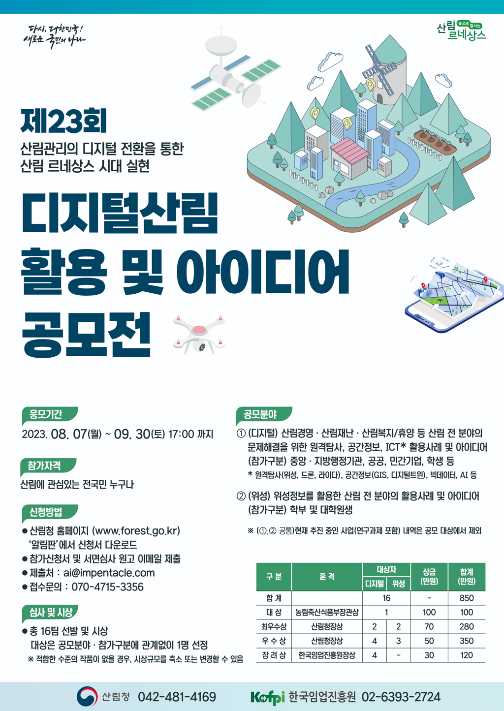접수된 작품은 1~2차에 걸친 전문가 심사를 통해 16개를 선정하여 농림축산식품부장관상(대상), 산림청장상(최우수상, 우수상), 한국임업진흥원장상(장려상)과 시상금(총 850만 원)을 ‘제23회 디지털산림 컨퍼런스’에서 수여할 예정이다.