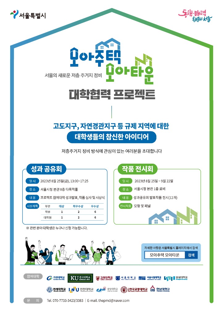 서울시는 8.25.(금) 서울시청 신청사(8층 다목적홀)에서 ‘모아주택・모아타운 대학협력 프로젝트 성과공유회’를 개최한다고 밝혔다. 시는 이번 프로젝트에서 제안된 아이디어를 모형과 패널로 제작, 8.25.(금)~9.22.(금) 신청사 1층에 전시한다.