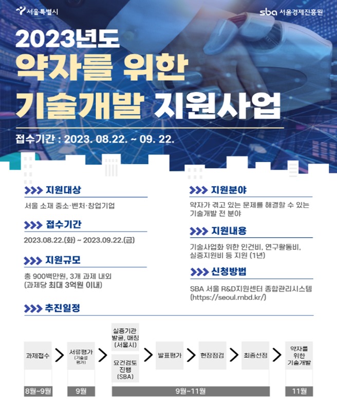 이번 약자를 위한 기술개발 지원 사업은 서울 소재 중소·벤처·창업기업 등 약자가 가진 문제를 해결할 수 있는 기술을 가지고 있다면 신청할 수 있으며 상세 내용은 ‘서울경제진흥원(www.sba.seoul.kr)’, ‘서울R&D지원센터(seoul.rnbd.kr)’ 누리집에서 확인할 수 있다.