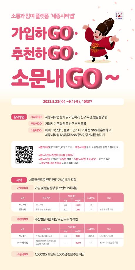 신규 가입과 알림설정, 추천을 받은 회원은 포인트가 2배 적립되며, 누리소통망(SNS)에 서비스 홍보 인증시 세종포인트 5,000점이 추가 적립되는 혜택이 제공된다.