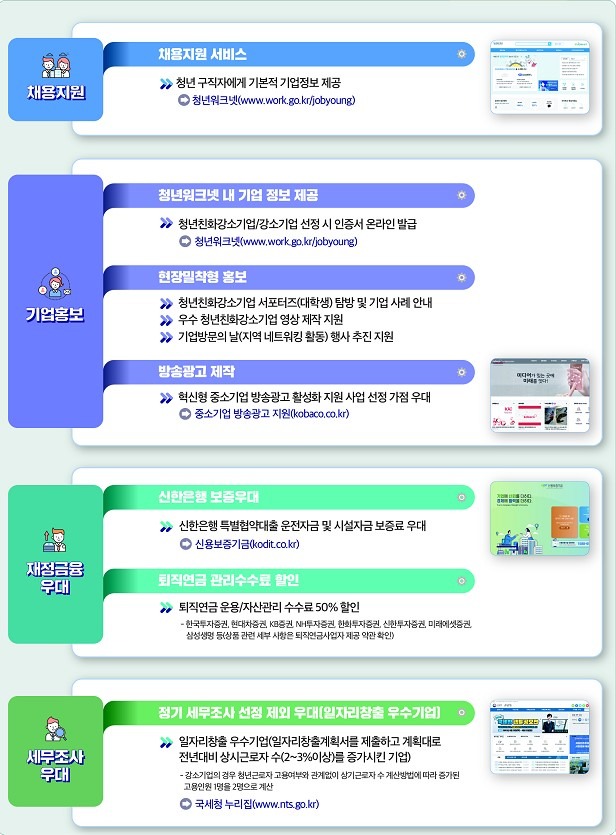 고용노동부 선정 '23년도 강소기업 또는 ?고용보험법?에 따른 ‘우선지원대상기업’이면 신청할 수 있다. 선정된 기업에 채용박람회 참여, 기업 홍보, 은행 대출 보증 우대, 세무조사 우대 등 다양한 혜택을 부여하며(붙임 1 참고), 최종 선정 결과는 12월 중순 발표될 예정이다.