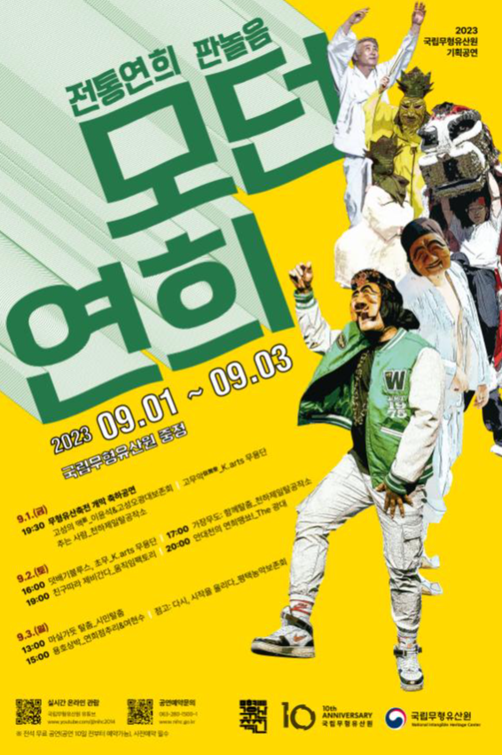문화재청 국립무형유산원은 오는 9월 1일부터 3일까지 국립무형유산원 중정(전북 전주시)에서 <전통연희 판놀음 : 모던연희> 공연을 개최한다.