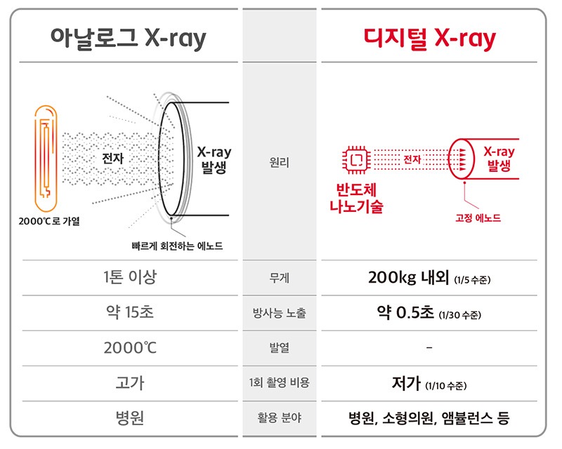 반면 나노엑스의 ‘디지털X-ray’는 손톱 크기의 실리콘 반도체를 이용한다. 반도체 속 약 1억 개의 나노 전자방출기를 디지털 신호로 제어해 찰나에 전자를 생성하고, X-ray로 전환하여 촬영한다. 필라멘트를 가열하거나 애노드를 빠르게 회전시키는 단계가 없다.