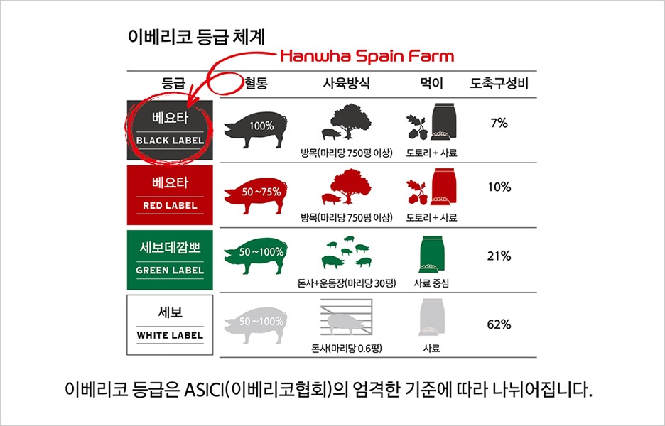 현재 사육중인 돼지는 스페인 세비야 북부 시에라 모레나(Sierra Morena) 국립공원 내에 있는 100% 순종 이베리코 흑돼지로 도토리를 먹여 방목한 최상위 베요타(Bellota) 등급이다. 베요타는 스페인어로 도토리를 뜻한다. 스페인에서 생산되는 이베리코 중 베요타 등급은 전체의 7% 가량에 불과하다. 스페인 이베리코협회(ASICI)의 인증을 받아야 한다. 이베리코는 세계 4대 진미 중의 하나로 꼽히기도 한다.