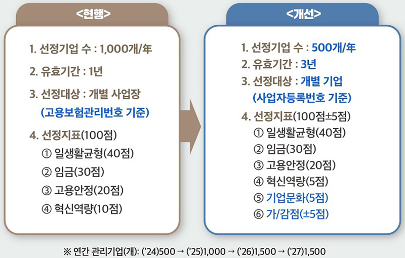 한편 고용부는 내년도에 더욱 우수한 기업을 선정하기 위해 그동안 현장의 목소리와 2030자문단 의견 등을 종합해 선정기준을 개편했다.