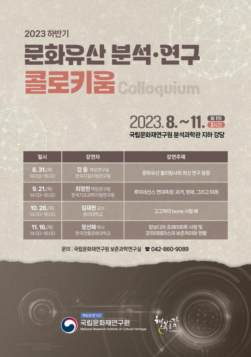 문화재청 국립문화재연구원은 8월부터 11월까지 매달 마지막 주 목요일 오후 2시에 국립문화재연구원 분석과학관(대전시 유성구)에서 문화유산 분석과 연구에 관한 다양한 주제로 각 분야의 전문가를 초청하여 이야기를 나누는『문화유산 분석·연구 콜로키움』을 개최한다.