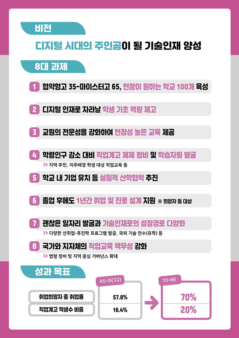 이 밖에 국가·지자체의 직업교육 책무성을 강화하기 위해 직업계고 졸업자의 고용 촉진 및 후속관리에 대한 근거 규정 신설 등 양질의 직업교육을 위한 제도적 뒷받침에도 힘쓴다.