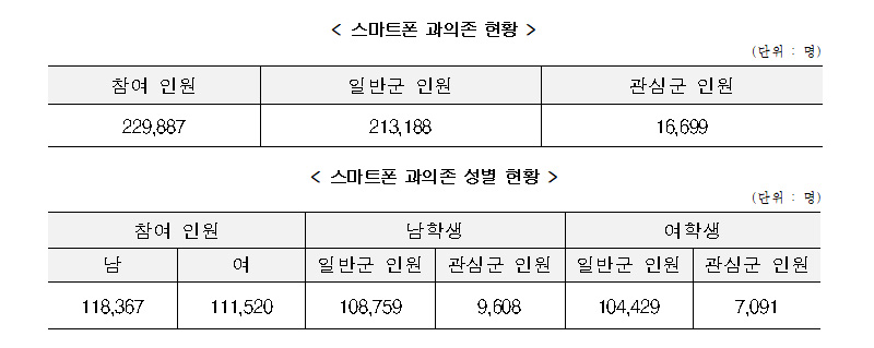 초등학교 1학년 진단조사에는 22만 9887명이 참여했으며, 조사 결과 1만 6699명이 사용지도가 필요한 스마트 과의존 관심군인 것으로 나타났다. 남자 초등생은 9608명, 여자 초등생은 7091명으로 집계됐다.