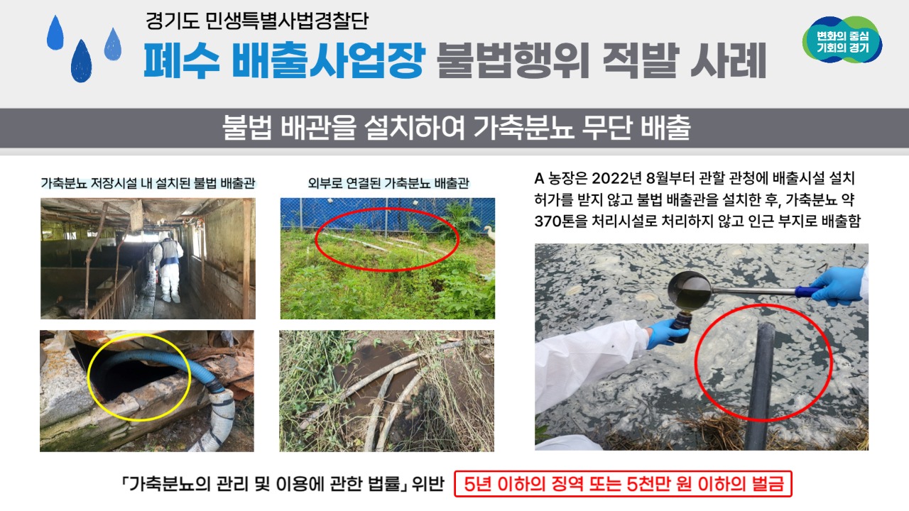 불법 배출관을 설치 후 인근 부지에 약 370톤의 가축분뇨를 무단 배출하는 등 관계 법령을 위반한 업체들이 경기도 민생특별사법경찰단에 적발됐다.