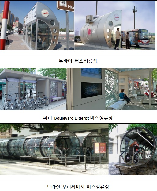 예컨대, 두바이에는 더운 날씨를 고려해 에어컨을 설치한 버스정류소를 도입했다. 파리 Boulevard Diderot 버스정류장은 추위에 대비한 히터와 음악감상, 핸드폰 충전, 인터넷 사용이 가능한 시설을 갖췄다. 싱가포르는 지붕녹화와 정보제공을 위한 스마트보드를 설치했고, 브라질 꾸리치바시는 지하철처럼 요금을 사전에 징수하는 시스템과 실내형 쉘터를 도입했다.