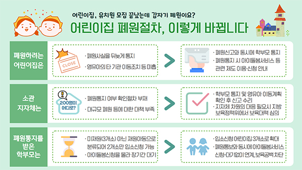 이에 따라 뒤늦은 폐원통지로 인해 다른 어린이집이나 유치원 입소가 어려워지는 경우가 많았고, 학부모에게 사전에 제때 통지를 했는지의 여부를 지자체가 확인할 수 있는 절차나 서식도 없는 상황이었다.