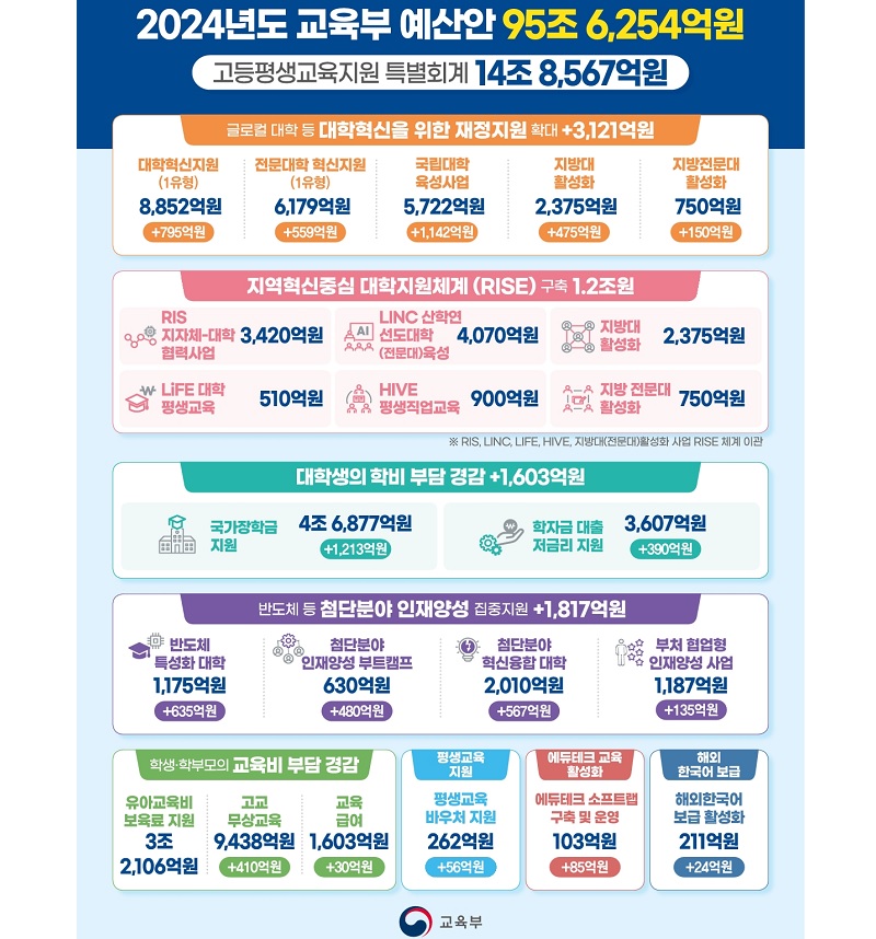 이주호 부총리 겸 교육부장관은 이번 2024년 예산을 통해 “대학 내 혁신은 물론 대학과 지역사회 간 벽을 허무는 지역혁신중심 대학지원체계(RISE)로 대규모 대학지원사업이 전환되는 초석이 마련되었고, 글로컬대학 등 대학혁신에 대폭 재정이 확충되면서 대학의 혁신 분위기가 고조될 것”이라고 밝혔다.