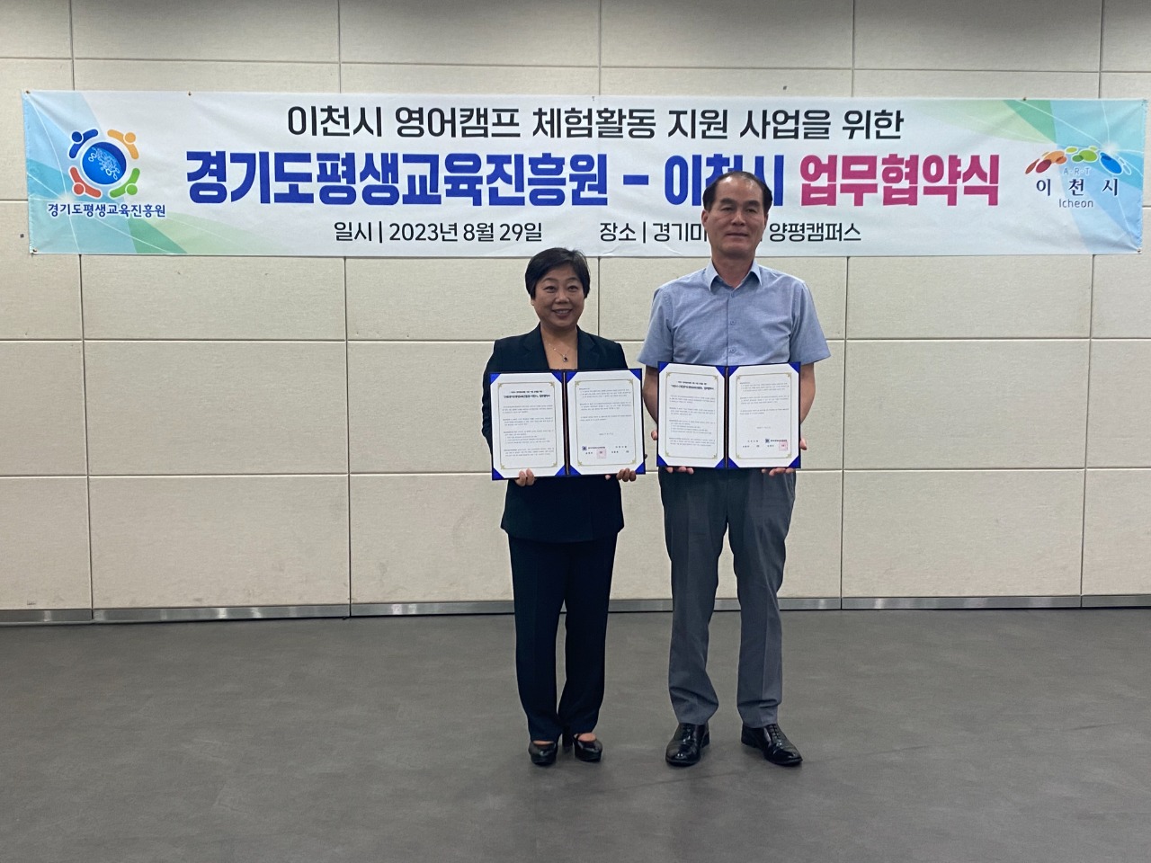 경기도평생교육진흥원 경기미래교육양평캠퍼스가 29일 양평캠퍼스에서 이천시와 미래형‧글로벌 인재 양성과 영어캠프 체험활동 지원사업 강화를 위한 업무협약(MOU)을 체결했다.