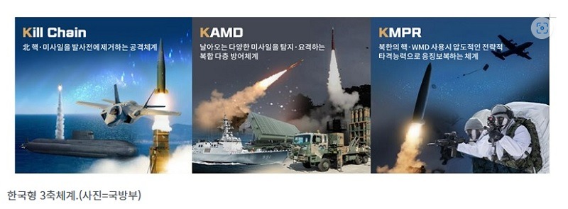 정부는 북한의 핵·미사일 위협 대응을 위해 사전 징후 포착과 선제 대응을 포함하는 킬체인, 한국형 미사일방어체계(KAMD), 대량응징보복(KMPR)을 아우르는 3축 체계를 강화한다.