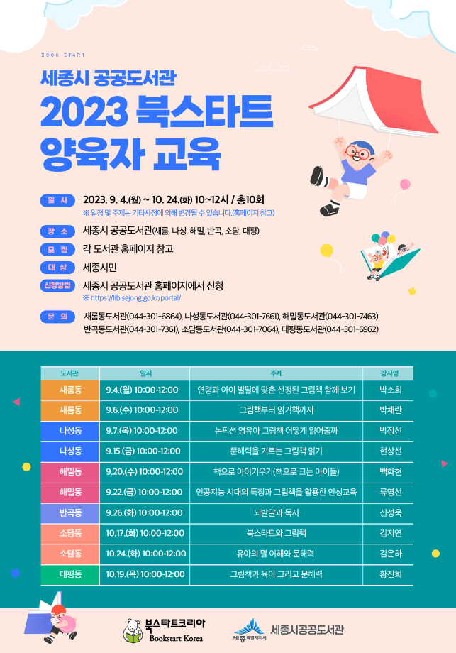 세종특별자치시 공공도서관이 독서의 계절을 맞아 9월부터 10월까지 영유아 부모 및 양육자들을 대상으로 ‘2023년 북스타트 양육자 교육’을 운영한다.