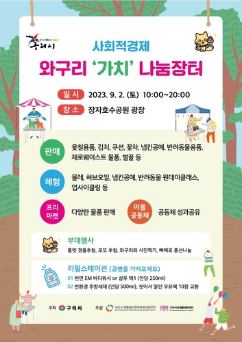 구리시는 오는 9월 2일(토) 오전 10시부터 오후 8시까지 장자호수공원 광장에서 사회적경제 활성화를 위한 '2023년 사회적경제, 와구리, 가치 나눔장터'를 개최한다.