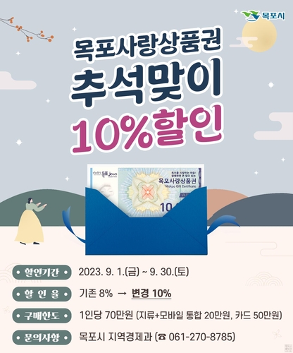목포시가 추석 명절을 맞아 오는 9월 1일부터 30일까지 한달간 목포사랑상품권 할인율을 8%에서 10%로 상향해 판매한다.