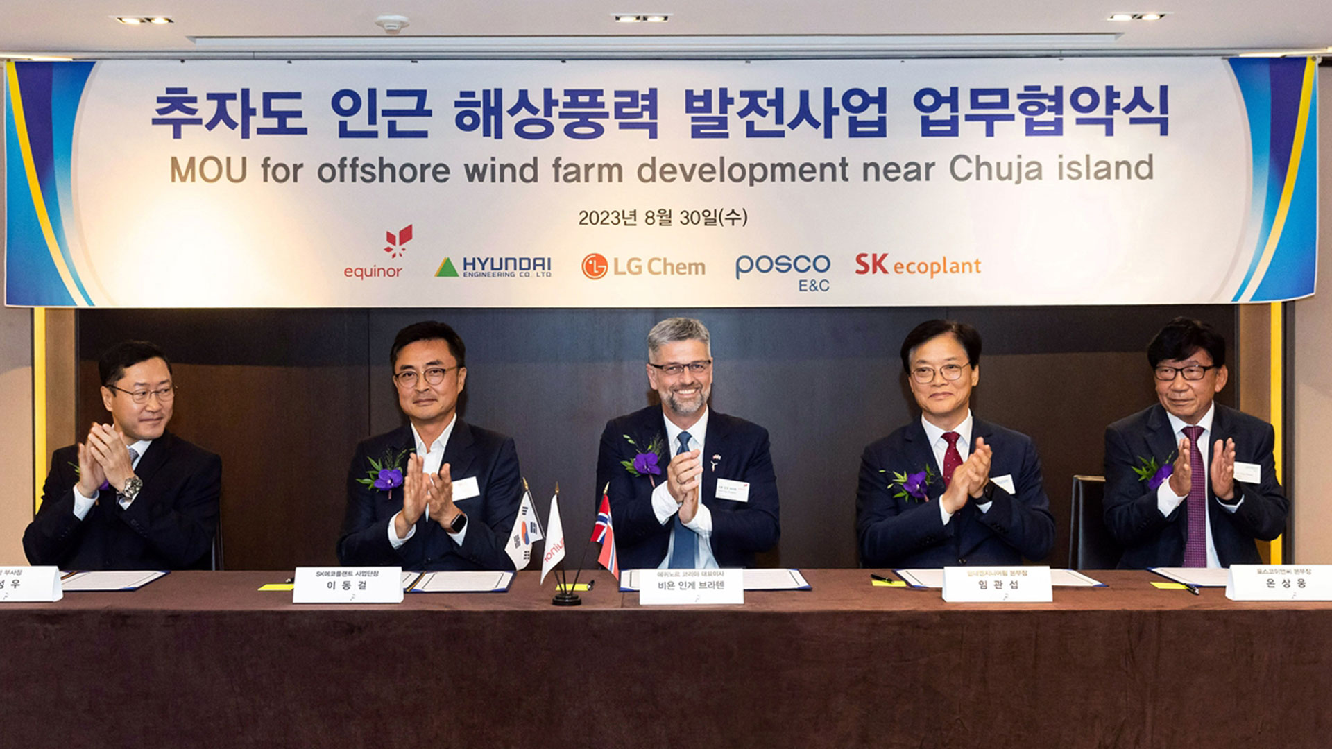 30일 서울시 중구 더플라자호텔에서 진행된 MOU 체결식에는 현대엔지니어링 임관섭 플랜트사업본부장, 에퀴노르코리아 비욘 인게 브라텐 대표이사, LG화학 허성우 부사장, 포스코이앤씨 온상웅 인프라사업본부장, SK에코플랜트 이동걸 부사장 등 관계자들이 참여해 차세대 신재생에너지로 각광받고 있는 해상풍력 사업 공동개발에 긴밀하게 협력할 것을 협의했다.