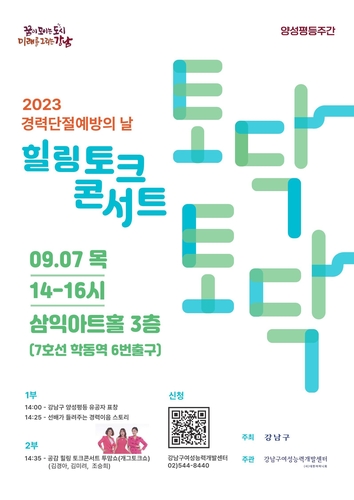 꿈이 모이는 도시, 미래를 그리는 강남구가 오는 9월 7일 오후 2시부터 4시까지 논현동 삼익아트홀(강남구 학동로 171)에서 '경력단절 예방의 날, 힐링 토크콘서트 토닥토닥'을 개최한다.