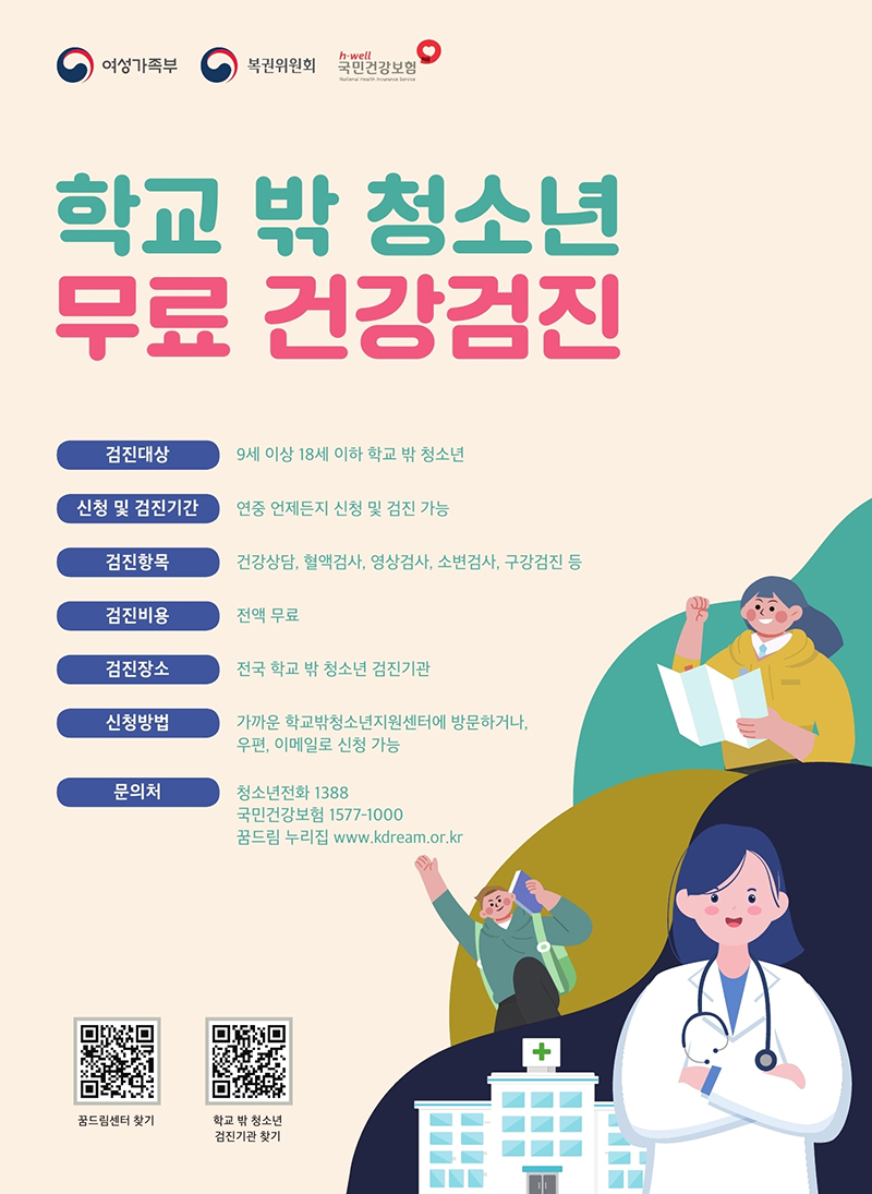 여성가족부는 학교 밖 청소년들이 무료로 건강검진을 받을 수 있도록 1일부터 오는 11월 30일까지 국민건강보험공단 및 전국 학교밖청소년지원센터 222곳(이하 꿈드림 센터)과 함께 건강검진을 집중 홍보한다고 1일 밝혔다.