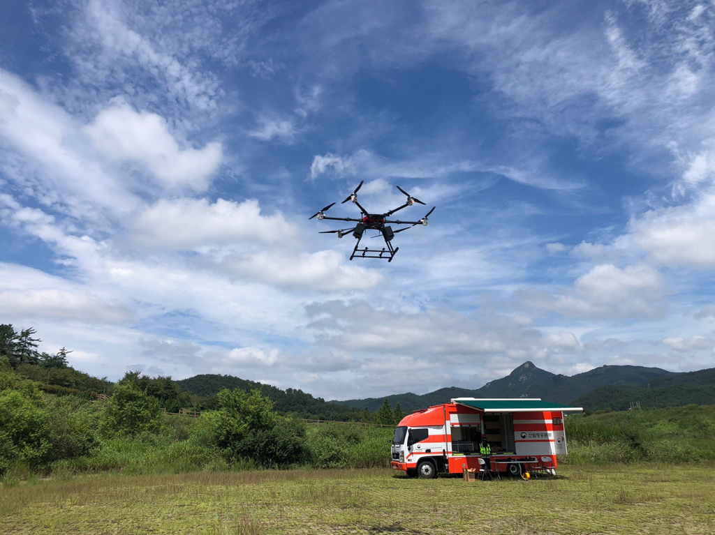 훈련과정은 정찰용 드론으로 정확한 산불 위치를 파악하고 진화용 드론을 활용해 진화탄을 발사하는 순서로 진행하였다.