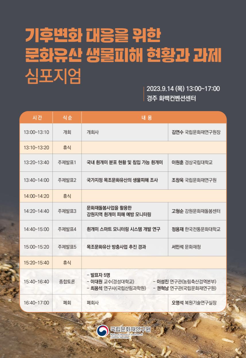 목재를 먹이로 생활해 목조문화유산에 심각한 피해를 일으키는 흰개미는 최근 급격한 기후변화로 서식이 늘어날 것으로 예상되어 이에 대한 대응이 필요한 상황이다. 이번 학술 토론회(심포지엄)는 흰개미와 관련하여 그동안에 이뤄진 관련기관의 연구활동을 공유하고, 앞으로의 과제에 대해 관련 기관, 학계 등과 논의하는 자리이다.