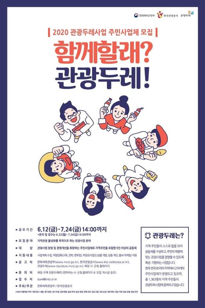 문화체육관광부(이하 문체부)는 지역 관광을 지속적으로 활성화하기 위해 한국관광공사(사장 안영배, 이하 관광공사)와 함께 6월 12일(금)부터 7월 24일(금)까지 ‘2020년 관광두레’ 신규 주민사업체를 모집한다.