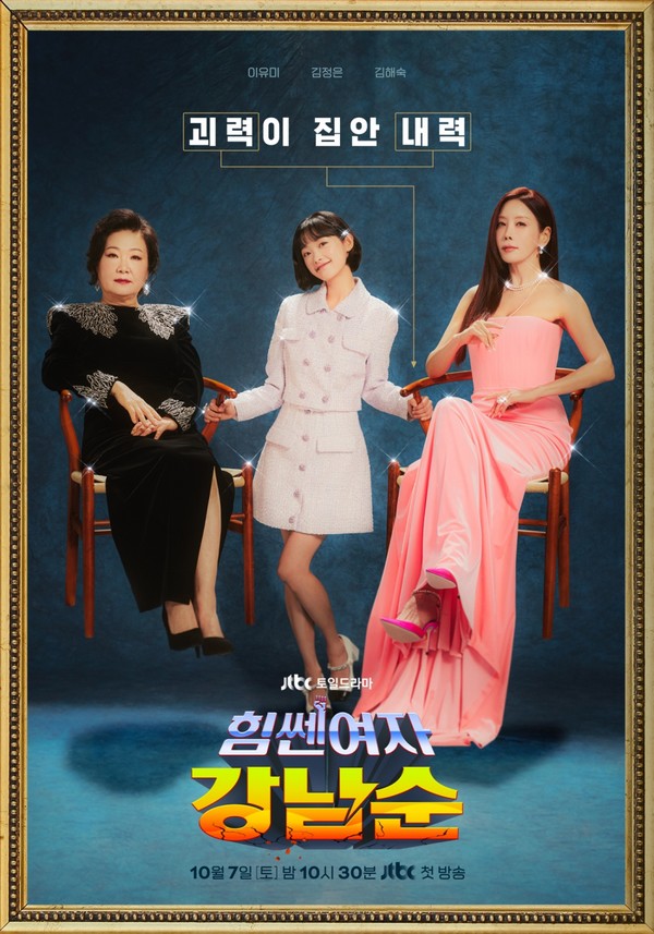 오는 10월 7일(토) 첫 방송되는 JTBC 새 토일드라마 ‘힘쎈여자 강남순’(극본 백미경, 연출 김정식·이경식, 제작 바른손씨앤씨·스토리피닉스·SLL) 측은 5일 강남순(이유미 분), 황금주(김정은 분), 길중간(김해숙 분) 3대 모녀의 남다른 아우라가 시선을 강탈하는 티저 포스터를 공개했다.