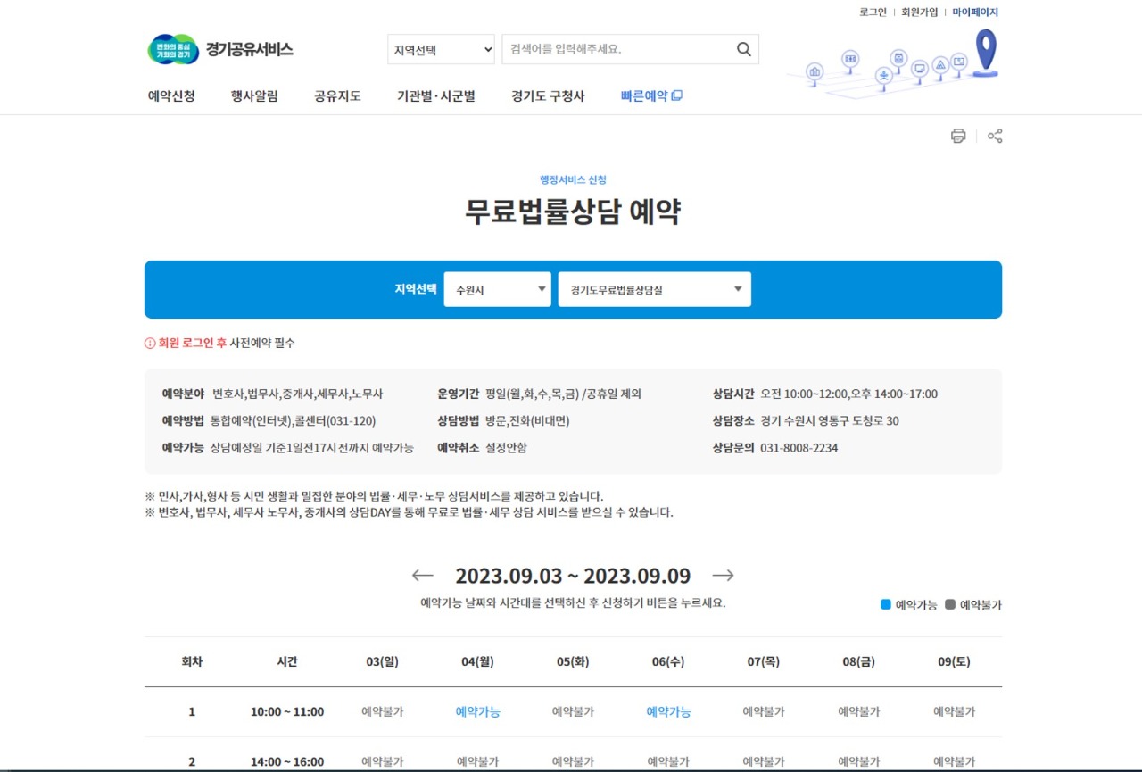 온라인 예약서비스는 경기공유서비스(share.gg.go.kr)에 회원가입 후 무료법률서비스 메뉴에서 경기도 및 19개 시군의 무료법률상담 서비스 내용 및 일정 등을 확인하고 상담받기 편리한 지역에서, 원하는 날짜에, 원하는 분야 상담을 예약하면 된다.