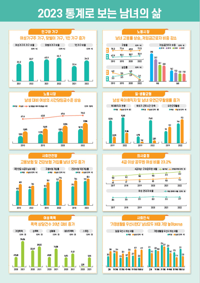 이번 ‘2023 통계로 보는 남녀의 삶’ 조사는 제28회 양성평등주간을 기념해 변화된 사회상을 반영한 남녀의 모습을 부문별 통계로 살펴보기 위해 이뤄졌다.