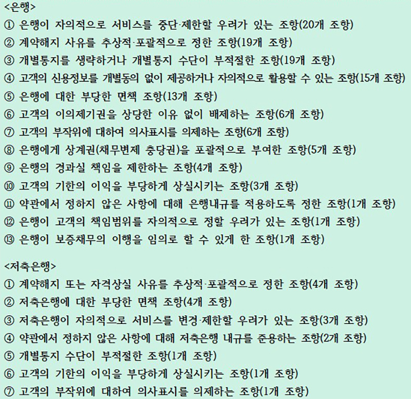 한편, 이번에 주요 불공정 유형으로 지적된 내용으로 은행이 자의적으로 서비스를 중지하거나 제한할 수 있게 해 고객의 예측가능성을 저해하고 피해를 줄 수 있는 약관이 포함돼 있었다.