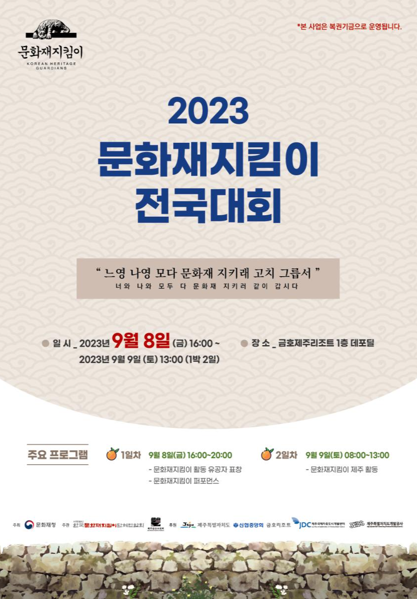 문화재청은 9월 8일과 9일 양일간 금호제주리조트(제주특별자치도 서귀포시)에서 (사)한국문화재지킴이단체연합회, (사)제주돌담보전회와 함께 ‘2023 문화재지킴이 전국대회’를 개최한다.