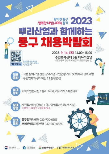 인천 동구는 9월 14일(목) 오후 2시 주민행복센터 3층 다목적 강당에서 '활기찬 동구, 행복한 내일찾기! 뿌리산업과 함께 하는 동구 채용 박람회'를 개최한다고 밝혔다.