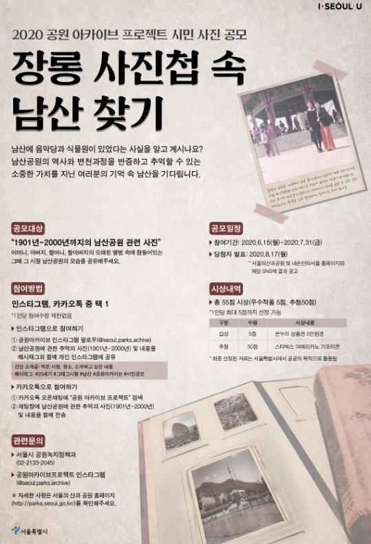 남산의 주요 시설(식물원, 분수대, 팔각정, 음악당, 케이블카, 남산타워, 동상 등)을 배경으로 하거나 나들이를 즐기는 모습, 기공식․기념식 등 각종 행사 등 남산 공원의 옛 풍경을 담은 사진 자료를 가진 누구나 응모할 수 있다.