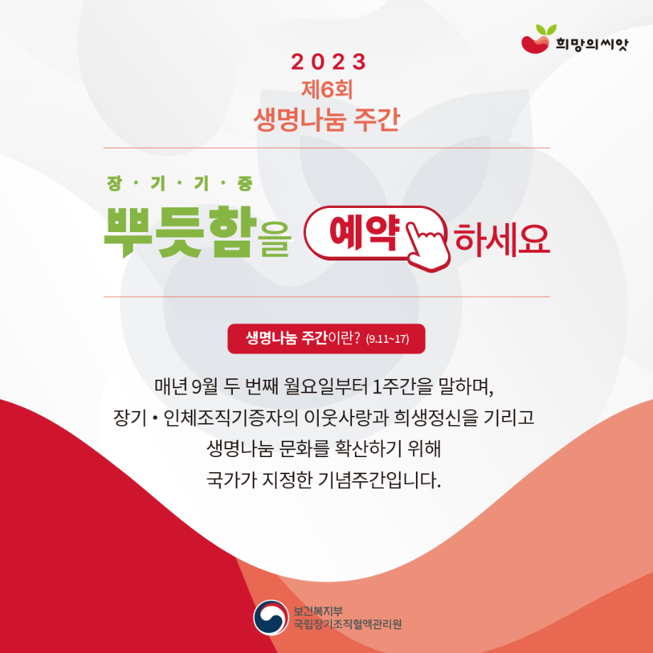 생명나눔 주간은 매년 9월 두 번째 주로, 장기 등 기증자의 이웃사랑과 희생정신을 기리고 생명나눔 문화를 확산하기 위한 다양한 행사를 시행하고 있다.