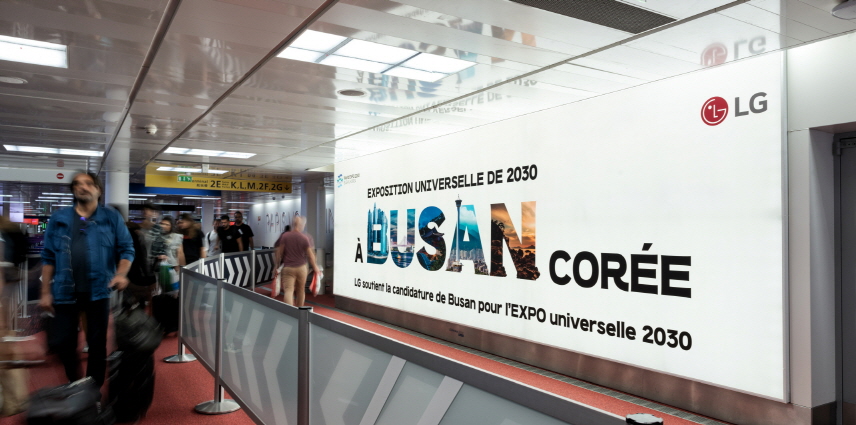 LG는 파리의 샤를드골 국제공항 내 6개의 대형 옥외광고판에 ‘2030 부산세계박람회’ 응원 문구를 선보였다. 샤를드골 국제공항은 파리를 비롯해 유럽 전역을 방문하는 사람들이 거쳐가는 관문으로 연간 이용객이 5천만 명이 넘는다.