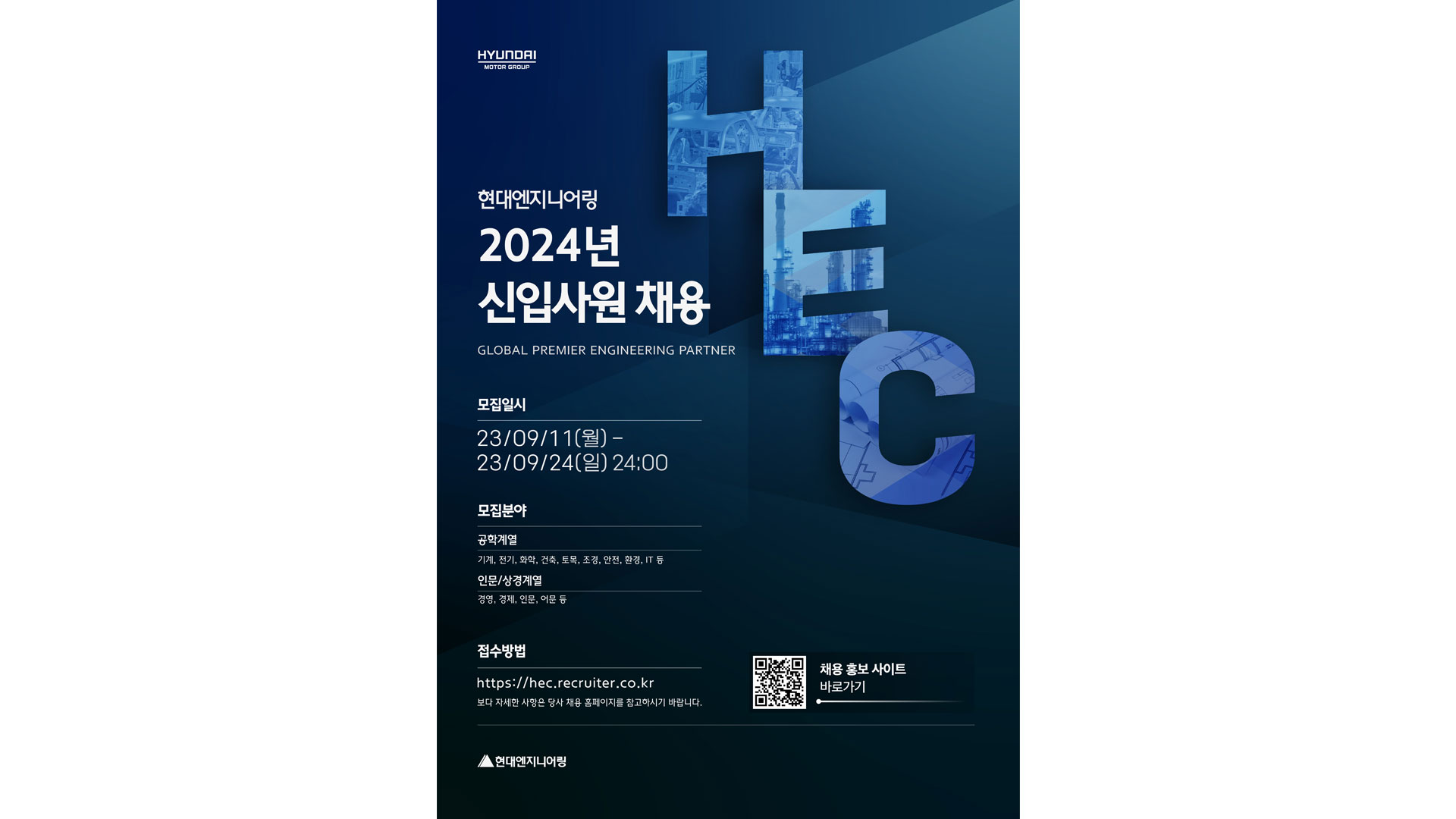 현대엔지니어링이 9월 11일(월)부터 24일(일)까지 2024년도 신입사원 공개채용에 나선다.